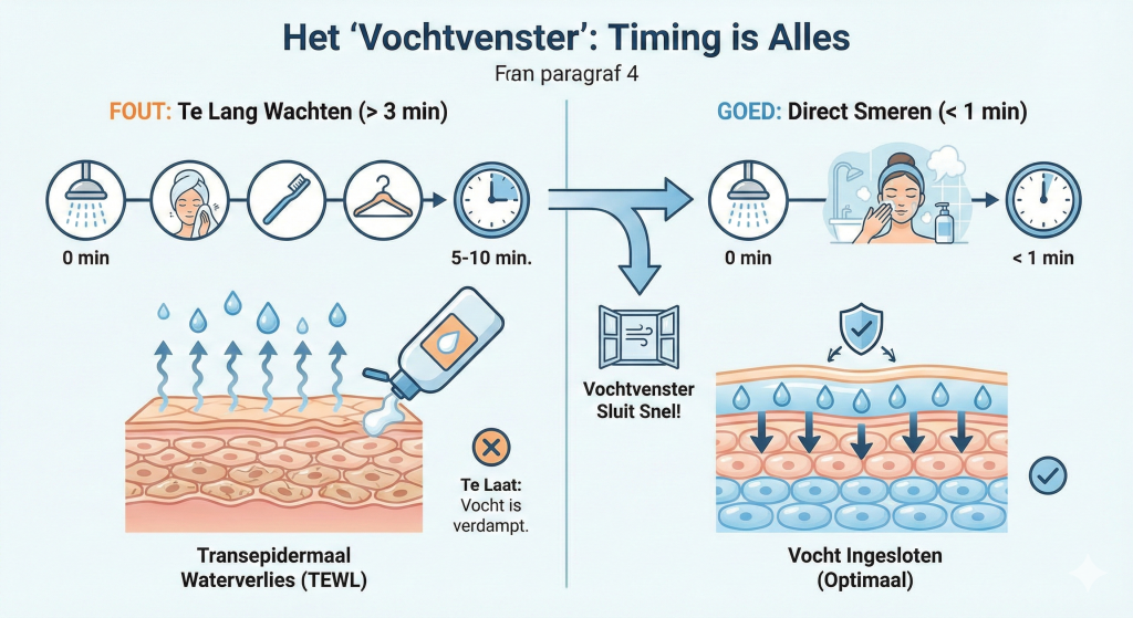 - De Wetenschap: Binnen 60 seconden na het douchen begint het water in je huid te verdampen (Transepidermaal Waterverlies). Als je te lang wacht, probeer je een uitgedroogde spons te hydrateren.