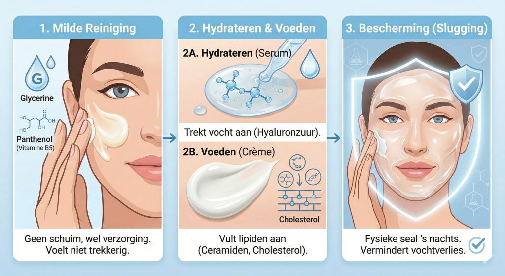 • Feit: Hoewel hydratatie van binnenuit belangrijk is, bereikt dat water zelden direct de opperhuid als je barrière lek is. Je moet het vocht fysiek ‘insluiten’ met de juiste vetten.
